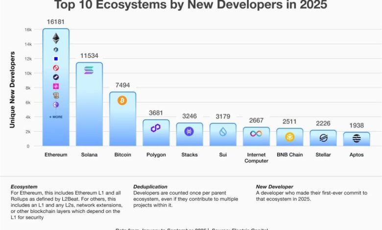 بر اساس دادههای الکتریک کپیتال، اتریوم از ژانویه تا سپتامبر ۲۰۲۵ تعداد ۱۶,۱۸۱ توسعهدهنده جدید جذب کرده که بیشتر از هر بلاکچین دیگری است. با این وجود، سولانا توانسته جایگاه خود را به عنوان داغترین اکوسیستم صنعت تثبیت کند.