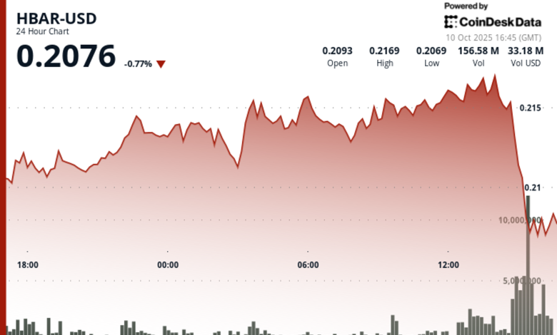 توکن HBAR هدرا هشگراف در دوره معاملاتی ۲۴ ساعته منتهی به ۱۰ اکتبر تحت فشار فروش سنگین مؤسساتی قرار گرفت، در حالی که قیمت‌ها در محدوده پرنوسان ۶ درصدی بین ۰.۲۱ تا ۰.۲۲ دلار در نوسان بود. با وجود مقاومت اولیه که باعث صعود HBAR به سمت最高های روزانه نزدیک به ۰.۲۲ دلار شد، این دارایی دیجیتال در ساعت پایانی معاملات به شدت معکوس شد، زیرا سرمایه‌گذاران مؤسساتی فروش‌های گسترده‌ای را آغاز کردند که سودهای قبلی را محو کرد.
