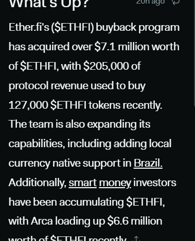 این افزایش در گفتگوها با اقدامات ملموس پروتکل مرتبط است. Ether.fi بیش از هفت میلیون دلار برای بازخرید (buyback) توکنهای خود هزینه کرده که از طریق درآمدهای پروتکل تأمین شده است. در یک مرحله اخیر، ۲۰۵,۰۰۰ دلار برای خرید ۱۲۷,۰۰۰ توکن ETHFI استفاده شد که ۱۵۵,۰۰۰ توکن سوزانده (burned) و ۱۰۸,۰۰۰ توکن نیز بین سهامداران (stakers) توزیع شد. این ترکیب از کاهش عرضه و توزیع، یک داستان ملموس برای تقویت توسط جامعه ایجاد کرده است.