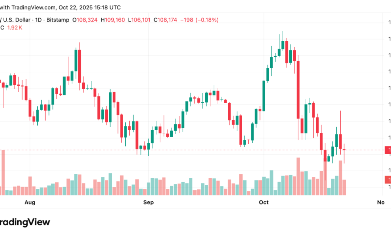 در زمان انتشار این خبر، بیتکوین پس از بازگشت از رشد ۳.۵ درصدی از ۱۱۴,۰۰۰ دلار، در محدوده ۱۰۸,۰۰۰ دلار معامله میشد.