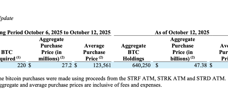 شرکت Strategy Inc. ذخایر عظیم بیت‌کوین خود را با خرید ۲۲۰ بیت‌کوین اضافی به ارزش ۲۷.۲ میلیون دلار گسترش داده است. این خرید در هفته ۶ تا ۱۲ اکتبر با قیمت متوسط ۱۲۳,۵۶۱ دلار برای هر بیت‌کوین انجام شد. دارایی‌های بیت‌کوین این شرکت اکنون به ۶۴۰,۲۵۰ بیت‌کوین رسیده که با هزینه کلی ۴۷.۳۸ میلیارد دلار و قیمت متوسط ۷۴,۰۰۰ دلار برای هر بیت‌کوین خریداری شده‌اند.