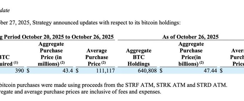 شرکت استراتژی (Strategy) به رهبری مایکل سیلور، حامی بیتکوین، یک بار دیگر ذخایر بیتکوین خود را گسترش داده است. بر اساس گزارش منتشر شده در ۲۷ اکتبر، این شرکت بین تاریخهای ۲۰ تا ۲۶ اکتبر، ۳۹۰ بیتکوین (BTC) اضافی با هزینه ۴۳.۴ میلیون دلار و با قیمت متوسط ۱۱۱,۱۱۷ دلار برای هر بیتکوین خریداری کرده است. این خرید جدید، مجموع داراییهای استراتژی را به ۶۴۰,۸۰۸ بیتکوین رسانده که با قیمت کلی خرید ۴۷.۴۴ میلیارد دلار تهیه شدهاند. قیمت متوسط خرید شرکت در حال حاضر با احتساب کارمزدها و هزینهها، ۷۴,۰۳۲ دلار برای هر بیتکوین است.
