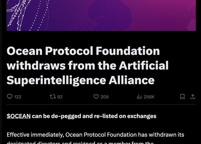 بنیاد Ocean اعلام کرد که از تمامی نقشهای مدیریتی و عضویتی خود در «اتحادیه ابرهوش مصنوعی» مستقر در سنگاپور کنارهگیری میکند که به معنای پایان همکاری با Fetch.ai و SingularityNET است. اگرچه این بنیاد به محدودیتهای قانونی برای افشای جزئیات کامل اشاره کرد، اما به وجود اختلافات عمیقتر اشاره نمود: «در حال حاضر از بیان حقایق منع شدهایم. لطفاً منتظر بمانید تا فرآیند قانونی طی شود و به محض امکان افشای اطلاعات بیشتر، این کار را انجام خواهیم داد.»