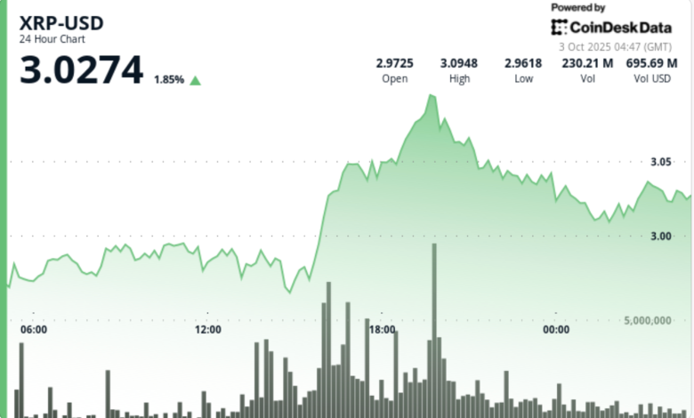 XRP در بازه زمانی ۲ اکتبر ساعت ۰۴:۰۰ تا ۳ اکتبر ساعت ۰۳:۰۰ با رشد ۳ درصدی از ۲.۹۸ دلار به ۳.۰۳ دلار صعود کرد. این رالی پس از گسترش خدمات وامدهی موسسی XRP توسط SBI Holdings صورت گرفت که نشاندهنده عمقگیری فشار crypto در ژاپن است. در همین حال، دیوید شوارتز، مدیر ارشد فناوری ریپل پس از ۱۳ سال خروج خود را اعلام کرد، و هفت درخواست صندوق قابل معامله XRP تحت بررسی SEC باقی ماندهاند که اولین تصمیمها در ۱۸ اکتبر انتظار میرود. بازارهای پیشبینی هم اکنون احتمال تصویب را بالای ۹۹ درصد قیمتگذاری میکنند که ورودهای سفتهبازی را تقویت میکند.