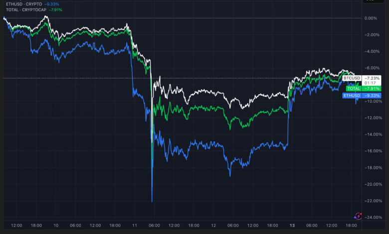 بیت‌کوین (BTC) در یک روز ۷.۸٪ سقوط کرد و از ۱۲۲,۵۸۲ دلار به زیر ۱۱۰,۰۰۰ دلار رسید، در حالی که اتریوم (ETH) کاهش شدیدتری معادل ۱۲.۳۳٪ را تجربه کرد و در دهم اکتبر از ۴,۳۶۸ دلار به کف ۳,۴۳۵ دلار سقوط کرد.