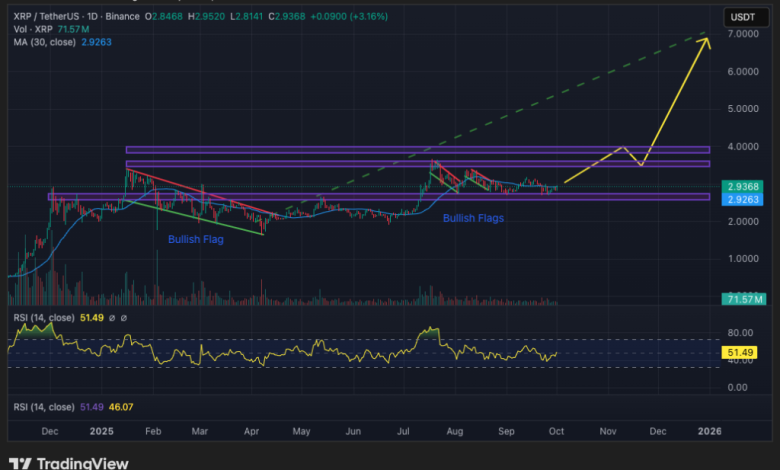 حتی با وجود اینکه کاهش نرخ بهره فدرال رزرو و راه‌اندازی اولین صندوق قابل معامله در بورس (ETF) XRP در پایان ماه گذشته باعث شکست مقاومت (Breakout) نشد، اما وجود سه الگوی پرچم صعودی (Bullish Flag) در نمودارها، همراه با تصمیمات قریب‌الوقوع در مورد ETF که در اواسط اکتبر انتظار می‌رود، می‌تواند XRP را تا سال جدید میلادی به ۷ دلار برساند.