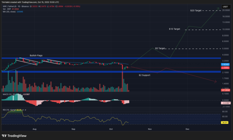تحلیل تکنیکال دو تشکیل الگوی پرچم صعودی (Bullish Flag) را در نمودارهای تابستانی XRP نشان میدهد. اگر تاییدیههای ETF (صندوق قابل معامله در بورس) تا اواسط اکتبر محقق شوند، خوشبینی تازه میتواند XRP را به محدوده ۵ تا ۱۰ دلار برساند. اگر قانونگذاری جامع و طولانیمدت کریپتو در آمریکا بالاخره از راه برسد، سقف قیمتی حتی ممکن است به ۲۰ دلار نیز برسد.