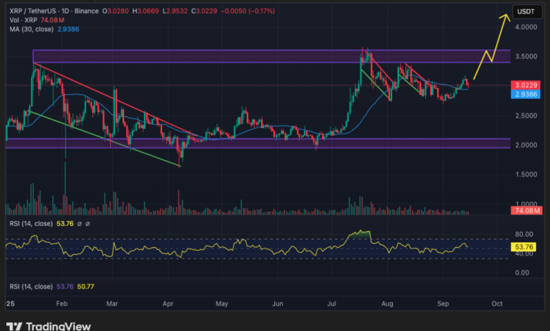 XRP کمی بالاتر از میانگین متحرک 30 روزه خود (2.90 دلار) در نوسان است، اگرچه به احتمال زیاد به زودی با آن همگرا میشود. قیمت کنونی آن 3 دلار است که دادههای اخیر نشان میدهد یک سطح حمایت روانی قوی برای این توکن است، بنابراین توانسته موضع خود را حفظ کند. با این حال، جامعه XRP امیدوار است که تا اکتبر可能的 rally به سمت 4 دلار را شاهد باشد.