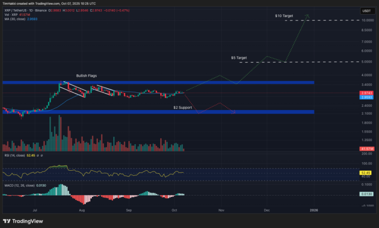 اگرچه محرکهایی مانند کاهش نرخ بهره و تأیید اولین صندوق قابل معامله در بورس (ETF) XRP در ماه گذشته، باعث رشد فوری نشدند (احتمالاً به دلیل قیمتگذاری قبلی در بازار)، اما معاملهگران همچنان خوشبین هستند. تشکیل دو الگوی پرچم صعودی در طول تابستان، به شکست قریبالوقوع اشاره دارد.