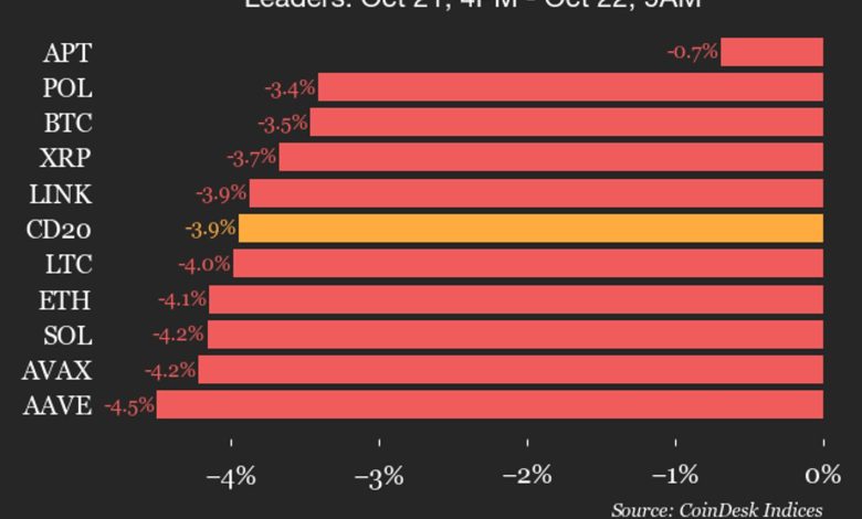 بهروزرسانی عملکرد CoinDesk ۲۰: شاخص ۳.۹ درصد افت کرد و تمامی اجزای آن با کاهش معامله شدند