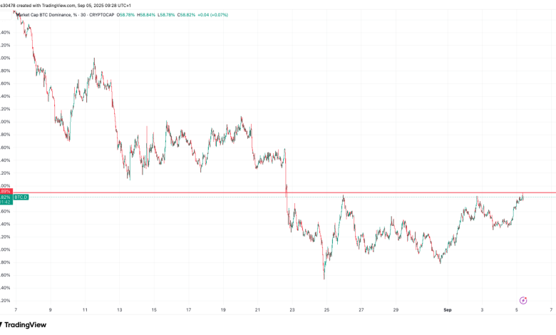 تسلط بازار بیتکوین (Bitcoin Dominance) که نشاندهنده سهم آن از کل بازار ارزهای دیجیتال است، نیز به نزدیک به ۵۹٪ صعود کرد که بالاترین سطح در دو هفته اخیر محسوب شده و از کف ۵۷.۵٪ افزایش یافته است. این امر حاکی از ورود مجدد جریان سرمایه به بیتکوین است و نشاندهنده تغییر در پویایی اخیر بازار است که با خروج نهنگها از بیتکوین و ورود به اتر (Ether) مشخص میشد.