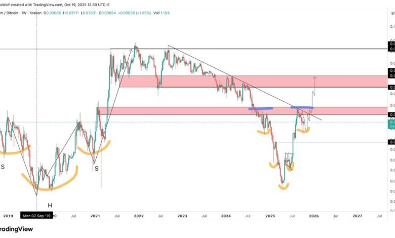 در حال حاضر، نسبت ETH/BTC در عدد ۰.۰۳۶۵۴ قرار دارد که بیش از ۱۲۰٪ با سطح مقاومت ۰.۰۸۷ فاصله دارد.