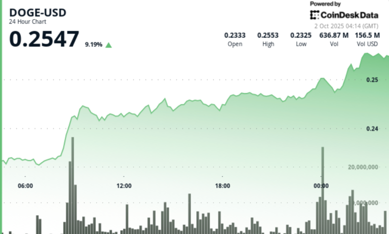 دوجکوین در بازه ۲۴ ساعته از ۱ اکتبر ساعت ۰۳:۰۰ تا ۲ اکتبر ساعت ۰۲:۰۰ با رشد ۸.۸ درصدی از ۰.۲۳ دلار به ۰.۲۵ دلار صعود کرد. این حرکت تحت تأثیر شایعات حول تأیید صندوقهای قابل معامله در بورس (ETF) آمریکا و موقعیتگیری تهاجمی نهادهای مالی شکل گرفت. شیبا نیز در همین بازه ۶.۲ درصد افزایش یافت، درحالی که ذخایر صرافیها به کمترین سطح چند سال اخیر رسید که بر کاهش عرضه قابل دسترس در پی افزایش تقاضا برای ممکوینها تأکید دارد.