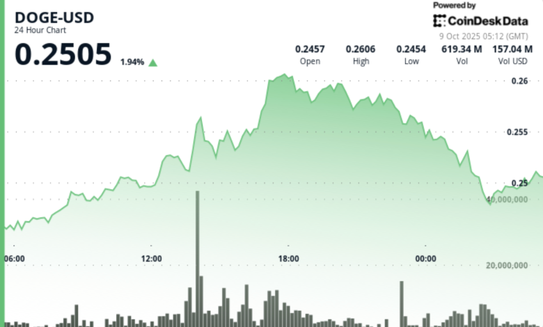 در ۲۴ ساعت منتهی به ۹ اکتبر، دوجکوین در محدوده ۶ درصدی بین ۰.۲۴ تا ۰.۲۶ دلار معامله شد. این توکن در جلسه معاملاتی بعدازظهر به ۰.۲۶ دلار صعود کرد اما با فشار فروش قوی مؤسسات مواجه شد. آدرسهای نهنگها بیش از ۳۰ میلیون دوج اضافه کردند که نشاندهنده تقویت موقعیتگیری بلندمدت علیرغم ضعف کوتاهمدت است.