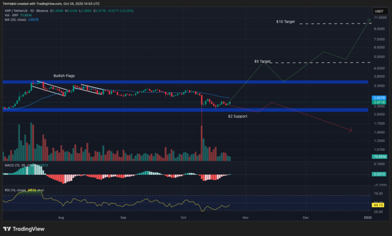 الگوهای تکنیکال دو formation پرچم صعودی را در طول تابستان نشان میدهند که نشان میدهد در صورت تایید ETFها تا اواسط اکتبر، فضای بیشتری برای appreciation وجود دارد. تصویب مقررات جامع کریپتو در آمریکا میتواند XRP را به سمت محدوده ۵ تا ۱۰ دلار سوق دهد.