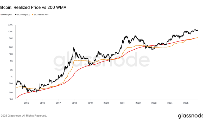 دادههای گلاسنود نشان میدهد که میانگین متحرک ۲۰۰ هفتهای (200WMA) – که قیمت بیتکوین را در افق بلندمدت هموار میکند و از نظر تاریخی فقط روند صعودی داشته است – به تازگی از مرز ۵۳,۰۰۰ دلار عبور کرده است. در همین حال، قیمت تحققیافته (Realized Price) – میانگین قیمتی که تمام بیتکوینهای در گردش آخرین بار در زنجیره بلوکی جابجا شدهاند – به تازگی از میانگین متحرک ۲۰۰ هفتهای در سطح ۵۴,۰۰۰ دلار فراتر رفته است.