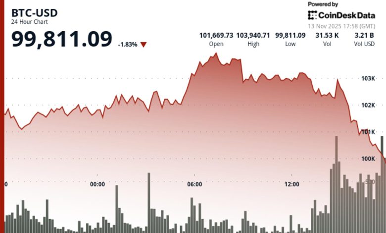 **بهروزرسانی (۱۳ نوامبر، ساعت ۱۷:۰۵ به وقت جهانی):** قیمت بیتکوین در زیر ۱۰۰٬۰۰۰ دلار بهروز شد.