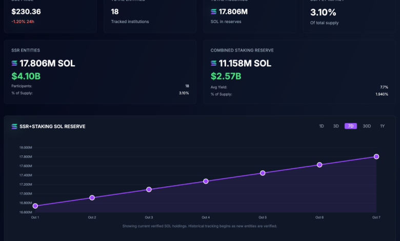 بر اساس داده‌های Strategic Solana Reserve، دارایی‌های خزانه‌داری نهادی سولانا از ۴ میلیارد دلار در بین ۱۸ شرکت تحت نظارت فراتر رفته است. این شرکت‌ها در مجموع ۳.۱٪ از عرضه در گردش سولانا را کنترل می‌کنند.