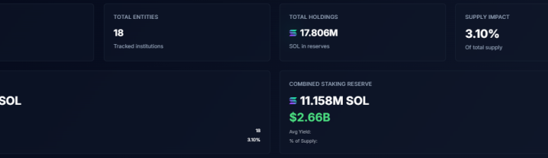 دادههای ذخیره استراتژیک سولانا نشان میدهد که داراییهای نهادی در ۱۸ شرکت کننده از ۴ میلیارد دلار فراتر رفته که حدود ۳.۱٪ از عرضه در گردش توکن را نمایندگی میکند. فوروارد اینداستریز با ۶.۸ میلیون SOL به ارزش ۱.۶۹ میلیارد دلار پیشتاز است و پس از آن شارپس تکنولوژی با ۲.۱ میلیون SOL و دیفای دولوپمنت کورپ با کمی بیش از ۲ میلیون SOL قرار دارند.