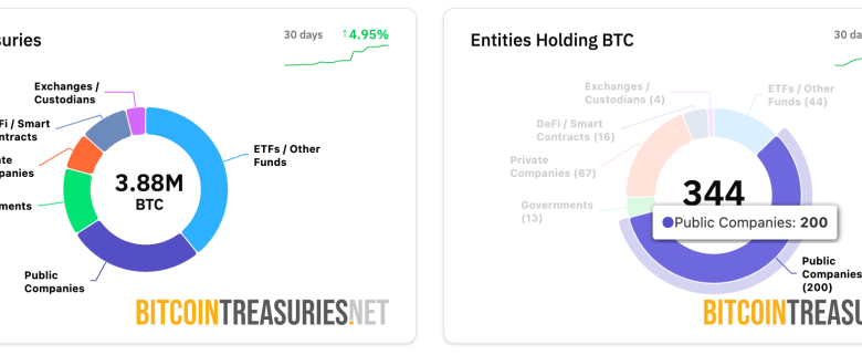 در مجموع، شرکتهای عمومی اکنون تقریباً 1,040,961 بیتکوین را در 200 شرکت کنترل میکنند، رقمی که تنها در یک ماه گذشته نزدیک به 4.89% افزایش یافته است.