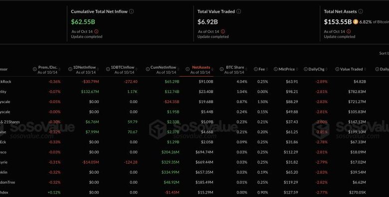 تا تاریخ ۱۴ اکتبر، صندوقهای ETF بیتکوین در مجموع ۱۵۳.۵۵ میلیارد دلار دارایی تحت مدیریت دارند که معادل ۶.۸۲٪ از کل ارزش بازار بیتکوین است. ورودیهای تجمعی اکنون به ۶۲.۵۵ میلیارد دلار رسیدهاند، در حالی که حجم معاملات روزانه ۶.۹۲ میلیارد دلار بود که نشاندهنده فعالیت قوی سرمایهگذاران حتی در میان نوسانات جاری است.