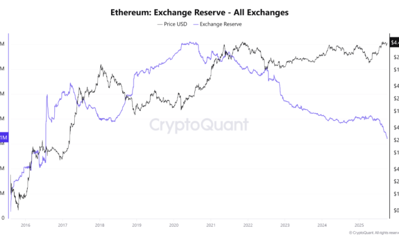ذخایر صرافی‌ها به حدود ۱۶.۱ میلیون ETH کاهش یافته که از سال ۲۰۲۲ بیش از ۲۵٪ افت داشته و نشان‌دهنده کاهش ساختاری فشار فروش است.