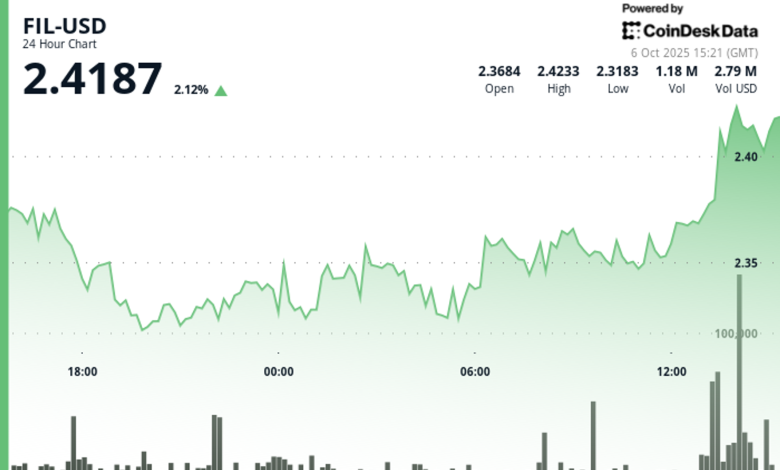 بر اساس مدل تحلیل تکنیکال کوindesk ریسرچ، قیمت فیلكوين (FIL) طی ۲۴ ساعت گذشته ۲ درصد افزایش یافته و از سطح ۲.۳۷ دلار به ۲.۴۲ دلار رسیده است.