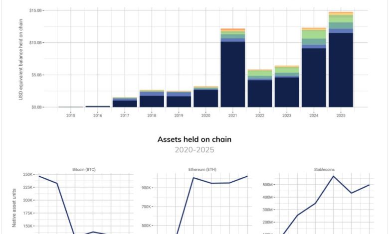 بر اساس داده‌های رهگیری شده تا ژوئیه ۲۰۲۵، موجودی‌های نهادهای غیرقانونی شامل بیت‌کوین (BTC)، اتریوم (ETH) و استیبل‌کوین‌ها (Stablecoins) به نزدیک ۱۵ میلیارد دلار رسیده است. کیف‌پول‌های وابسته به این نهادها – که به عنوان گیرنده بیش از ۱۰٪ وجوه از منابع غیرقانونی تعریف می‌شوند – بیش از ۶۰ میلیارد دلار در اختیار دارند.