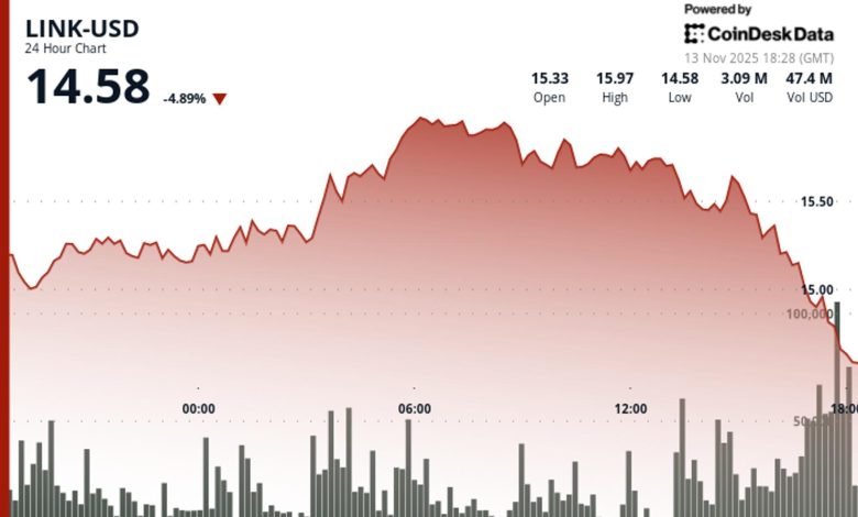 بر اساس داده‌های کوین‌دسک، لینک در طول روز از ۱۵.۲۶ دلار به ۱۴.۷۳ دلار سقوط کرد و سپس به کاهش خود ادامه داد و به پایین‌ترین سطح از اواخر اکتبر رسید. عملکرد این توکن از شاخص ۵ کوین‌دسک که در ۲۴ ساعت گذشته ۳.۷٪ کاهش یافته بود، ضعیف‌تر بود.