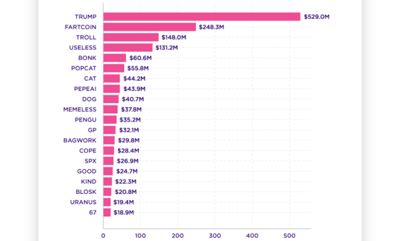 با نگاهی به ۵ میم کوین برتر سولانا بر اساس حجم خرید، یک نکته بلافاصله خودنمایی میکند. TRUMP با بیش از ۵۲۹ میلیون دلار ورودی در ۳۰ روز، نمودار را تحت سلطه خود دارد و بقیه بازار را با فاصله زیادی پشت سر میگذارد. FATCOIN (۲۴۸ میلیون دلار) و TROLL (۱۴۸ میلیون دلار) سه مورد برتر را تکمیل میکنند، اما فاصله بین TRUMP و بقیه قابل توجه است.