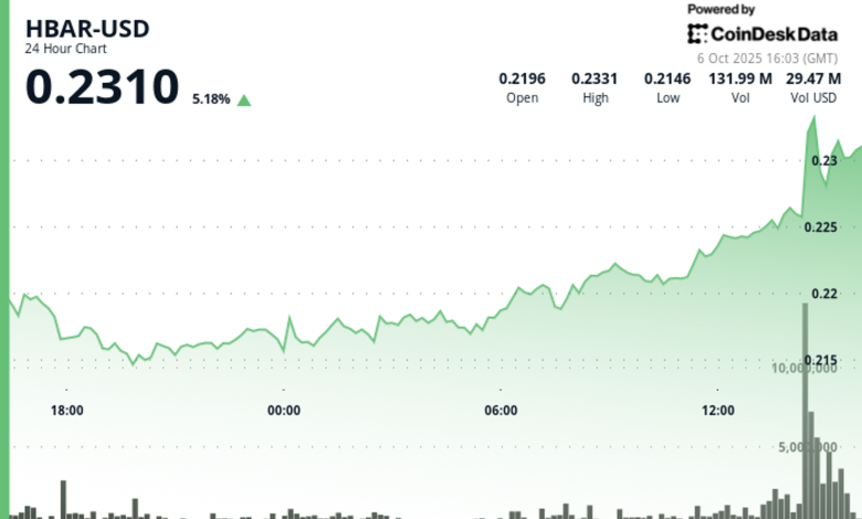 شتاب صعودی اضافی در ساعت پایانی معاملات ثبت شد که با رشد ۰.۴۶ درصدی، HBAR را به ۰.۲۳ دلار رساند، حتی در حالی که بازارهای سهام سنتی تحت فشار اختلافات تجاری جاری قرار داشتند.