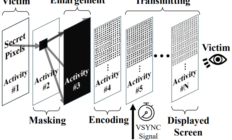پیکسناپینگ از API محو کردن پنجره اندروید و فراخوانیهای VSync استفاده میکند تا پیکسلهای حساس را به خط لوله رندرینگ مجبور کند، و با لایهبندی فعالیتهای نیمه شفاف، مدت زمان رندر شدن فریمهای خاص را اندازهگیری میکند. این الگوهای زمانبندی، مقدار رنگی هر پیکسل را آشکار میکنند که سپس میتوانند برای افشای دادههای حساس بازسازی شوند.