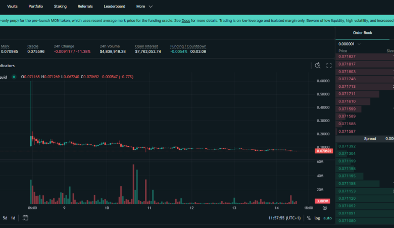 با وجود تبلیغات کلاهبرداری، انتظارات برای توکن MON همچنان بالا است. این توکن که هنوز عرضه نشده، در بازار فیوچرز صرافی هایپرلیکوید با قیمت حدود ۰.۰۷ دلار معامله میشود که نشاندهنده ارزش گذاری کاملاً رقیقشده (FDV) حدود ۷ میلیارد دلار بر اساس عرضه کل ۱۰۰ میلیارد توکن است.