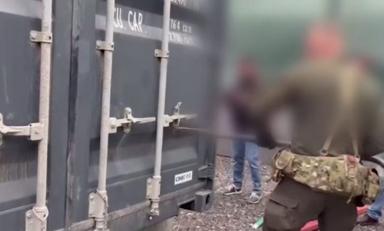 ویدیو نشان میدهد که مأموران یک مرد را در داخل یک ساختمان به زمین میزنند. سپس مأموران دیگر یک کانتینر حملونقل قفلشده را با یک اهرم باز میکنند.