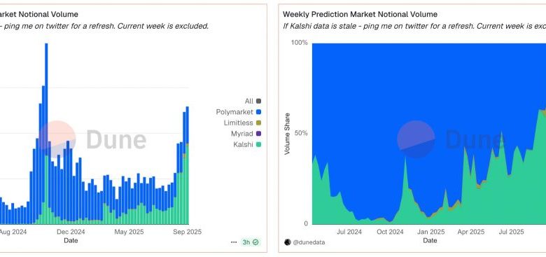 دادههای Dune Analytics نشان میدهد کالشی بین ۱۶ تا ۲۲ سپتامبر، ۶۶.۱۳ درصد از کل حجم بازار پیشبینی زنجیرهای را به خود اختصاص داد با بیش از ۸۵۴ میلیون دلار معامله و ۱۹۲ میلیون دلار موقعیت باز (open interest).