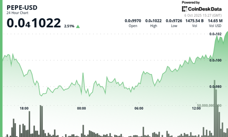 قیمت از ۰.۰۰۰۰۰۹۶۹ دلار به بالاترین حد ۰.۰۰۰۰۱۰۲۷ دلار صعود کرد و حجم معاملات در طول یک حرکت قیمتی سریع در ساعت پایانی معاملات از مرز ۳۱۴ میلیارد توکن گذشت. این آمار بر اساس مدل دادهای تحلیل تکنیکال تحقیقات کوindesk ثبت شده است.