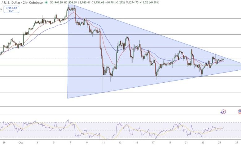 اتریم (جفت ارز ETH/USD) در حال تثبیت در داخل یک مثلث متقارن (Symmetrical Triangle) است – یک الگوی خنثی که اغلب مقدمبر شکستهای بزرگ است. این ساختار نشاندهنده حرکت فشرده قیمت بین خطوط روند همگرا است که نشانه واضحی از بلاتکلیفی معاملهگران محسوب میشود. اتریم در حال حاضر نزدیک به ۳۹۵۱ دلار معامله میشود، با حمایت قوی در ۳۸۶۵ دلار و مقاومت حول ۴۱۱۵ دلار که منطقه نبرد کلیدی برای تعیین جهت کوتاهمدت را تشکیل میدهند.