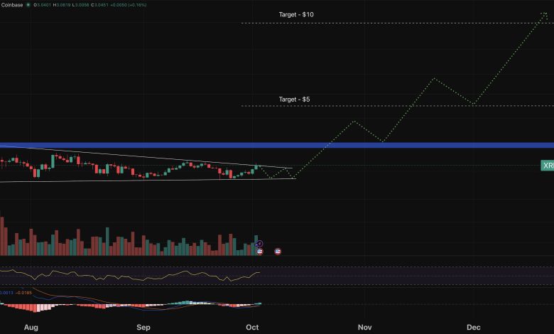 به نظر می‌رسد که XRP در شرف شکستن الگوی پرچم سه‌گوش (pennant) است که در هفته‌های اخیر در آن معامله می‌شده، در حالی که اندیکاتورهای آن هر دو به شدت از موقعیت‌های Oversold در حال افزایش هستند. این تغییرات در حالی رخ می‌دهند که Open Interest (سود باز) قراردادهای آتی XRP به ۸ میلیارد دلار بازگشته، پس از آنکه از کمی بیش از ۷ میلیارد دلار در ماه اوت افزایش یافت. این امر حاکی از افزایش قیمت‌ها است و انتظار می‌رود XRP تا پایان ماه به بیش از ۳.۵۰ دلار برسد، قبل از آنکه تا پایان سال به ۵ دلار دست یابد.