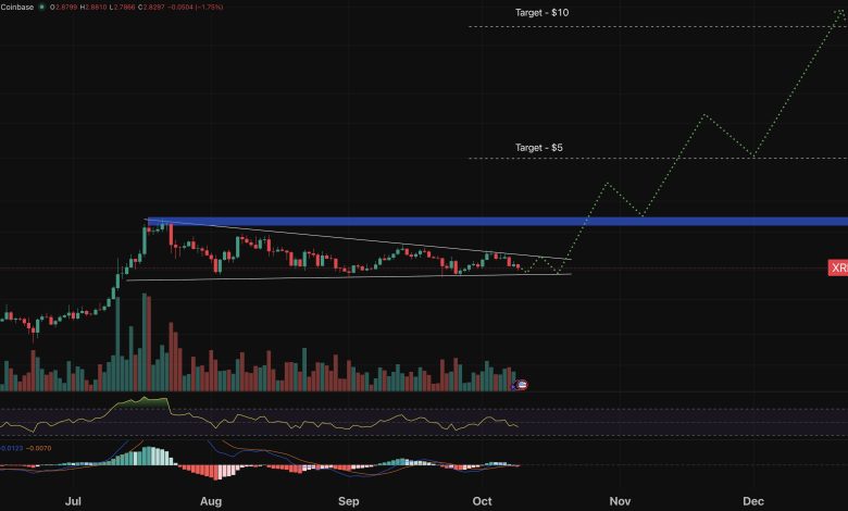 نمودار آن امروز نشان میدهد که یک رشد بزرگ ممکن است به زودی رخ دهد، بهویژه با توجه به اینکه اندیکاتورهای اصلی آن برای مدت طولانی در موقعیت اشباع فروش (Oversold) باقی ماندهاند. به محض راهاندازی ETFهای XRP، این موقعیت اشباع فروش میتواند سکوی پرتابی برای یک رشد بزرگ باشد و XRP در مسیر شکستن最高 قیمت تاریخی (ATH) فعلی خود در ۳.۶۵ دلار در نقطهای از ماه نوامبر قرار گیرد. از آنجا، ممکن است تا پایان دسامبر به ۵ دلار و در بلندمدت به ۱۰ دلار برسد.