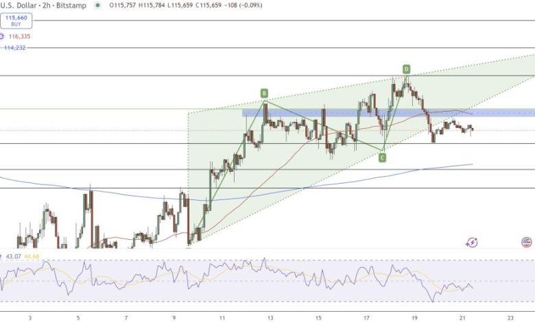 میانگین متحرک نمایی ۵۰ روزه (50-EMA) در ۱۱۶,۳۰۰ دلار، مانع از رشد بیشتر شده و میانگین متحرک نمایی ۲۰۰ روزه (200-EMA) در نزدیکی ۱۱۴,۲۰۰ دلار، اولین حمایت و پس از آن سطح ۱۱۳,۲۰۰ دلار است. یک شکست واضح below سطح ۱۱۵,۱۰۰ دلار به احتمال زیاد مسیر را به سمت ۱۱۴,۲۰۰ دلار باز میکند و اگر این سطح نیز شکسته شود، هدف بعدی ۱۱۲,۱۰۰ دلار خواهد بود.
