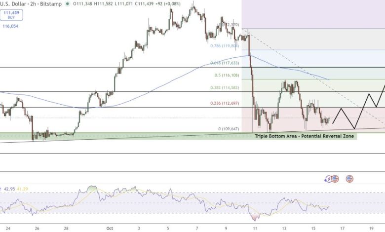 بیت‌کوین (BTC/USD) در حال تشکیل یک الگوی سه‌کف قوی در نزدیکی ۱۰۹,۶۰۰ دلار است که یک سطح کلیدی محسوب شده و از اواخر سپتامبر چندین بازگشت را رقم زده است. این ساختار، نشان از کاهش فشار فروش و افزایش انباشت دارد که با تشکیل کف‌های بالاتر در امتداد خط گردن همراه است. در نمودار دو ساعته، BTC زیر میانگین متحرک ساده ۱۰۰ دوره‌ای (SMMA) در ۱۱۶,۰۵۴ دلار معامله می‌شود که با سطح ۰.۵ فیبوناچی اصلاحی (Fibonacci retracement) در ۱۱۶,۱۰۸ دلار هم‌تراز شده و یک منطقه مقاومت قطعی قبل از شکست ایجاد می‌کند.