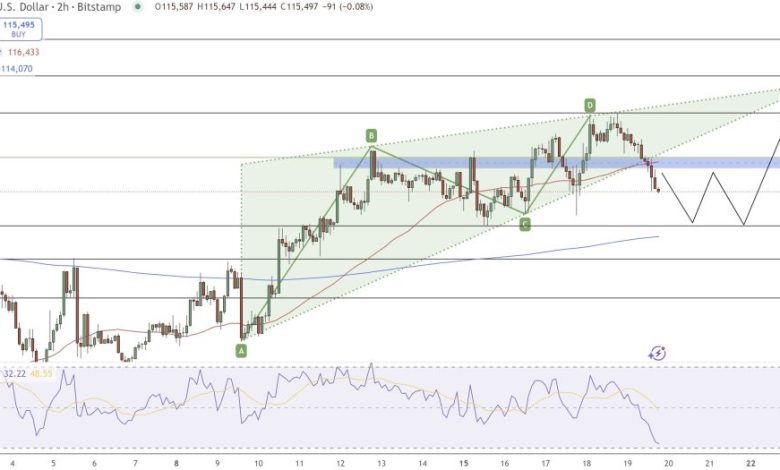 از نظر تکنیکال، بیت‌کوین در حال حرکت در یک منطقه حساس است. نمودار ۲ ساعته نشان می‌دهد که BTC زیر میانگین متحرک نمایی ۵۰ دوره‌ای (EMA-50) در ۱۱۶,۴۳۲ دلار滑落 کرده که ضعف پس از شکست یک الگوی گوه صعودی (rising wedge) – یک الگوی نزولی که نشان‌دهنده خستگی روند است – را تأیید می‌کند. حمایت فعلی نزدیک ۱۱۴,۴۱۲ دلار قرار دارد که توسط میانگین متحرک نمایی ۲۰۰ دوره‌ای (EMA-200) در ۱۱۴,۰۷۰ دلار تقویت شده است.