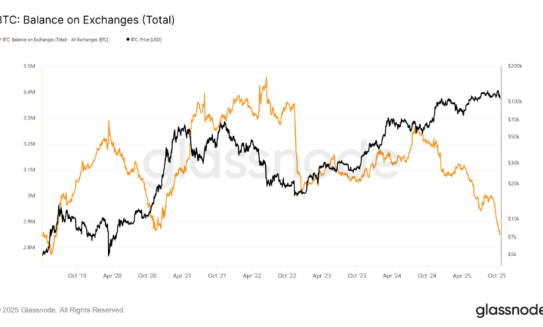 نمودار: ترازهای صرافی بیتکوین به کمترین سطح در شش سال گذشته رسیده که نشاندهنده افزایش انباشت بلندمدت است. منبع: گلاسنود (۲۰۲۵).