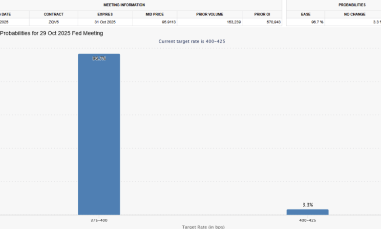 روند صعودی تاریخی بیتکوین در اکتبر ممکن است بار دیگر مورد آزمایش قرار گیرد، چرا که معاملهگران خود را برای کاهش احتمالی نرخ بهره فدرال رزرو در پایان این ماه آماده میکنند. بر اساس آخرین دادههای CME FedWatch، بازارها احتمال ۹۶.۷٪ را برای کاهش ۲۵ واحدی نرخ بهره صندوقهای فدرال از محدوده ۴.۰۰–۴.۲۵٪ به محدوده ۳.۷۵–۴.۰۰٪ قیمتگذاری کردهاند. تنها ۳.۳٪ از معاملهگران انتظار عدم تغییر را دارند.