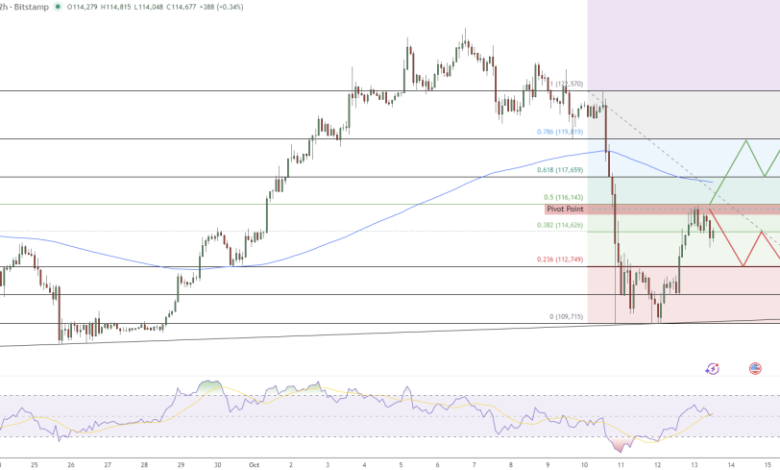 در نمودارها، پیش‌بینی قیمت بیت‌کوین در یک فاز تثبیت کوتاه‌مدت نزولی باقی مانده و بین حمایت ۱۱۲,۷۰۰ دلار و مقاومت ۱۱۶,۱۰۰ دلار در نوسان است. نمودار دو ساعته یک الگوی پرچم صعودی در حال توسعه را نشان می‌دهد – ساختاری که اغلب پس از اصلاح، سیگنال ادامه روند را می‌دهد.