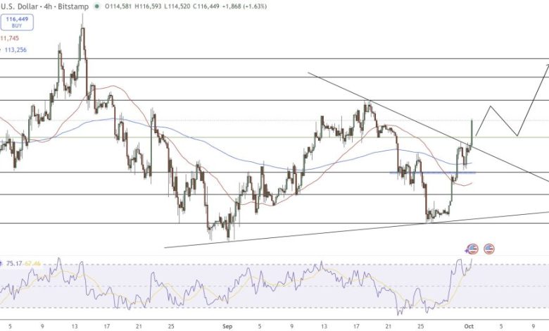 از نظر تکنیکال، بیتکوین یک شکست قاطع را تجربه کرده و با صعود به بالای ۱۱۶,۰۰۰ دلار، از خط روند نزولی که سقف رشدهای سپتامبر را محدود کرده بود، عبور کرده است. یک کندل پوششی صعودی (Bullish Engulfing) در نمودار ۴ ساعته، اعتقاد قوی خریداران را تأیید کرد که با تقاطع طلایی (Golden Cross)—حرکت میانگین متحرک نمایی ۵۰ دورهای (EMA) به بالای میانگین متحرک نمایی ۱۰۰ دورهای—تقویت شده است.