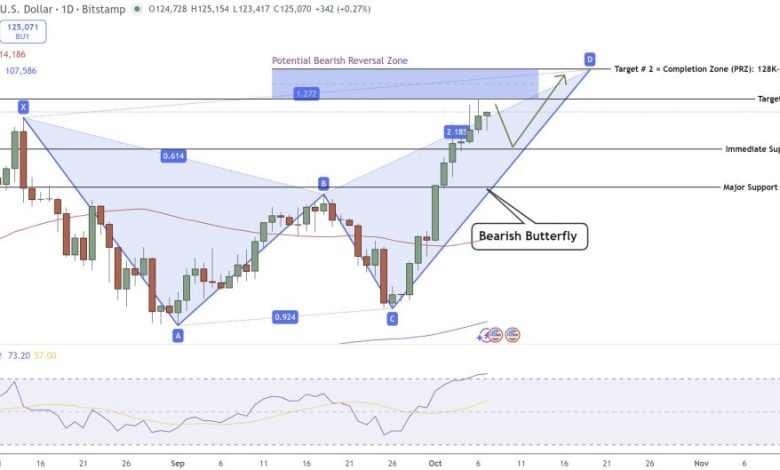 نمودار یک الگوی هارمونیک پروانهای نزولی (Bearish Butterfly) را نشان میدهد که به منطقه بازگشت بالقوه (Potential Reversal Zone) خود بین ۱۲۸,۰۰۰ تا ۱۳۰,۰۰۰ دلار نزدیک میشود. در همین حال، شاخص قدرت نسبی (RSI) نزدیک به ۷۳، شرایط کمی خرید بیش از حد را نشان میدهد و به یک توقف یا عقبنشینی کوتاهمدت قبل از هر فشار صعودی جدید اشاره دارد.