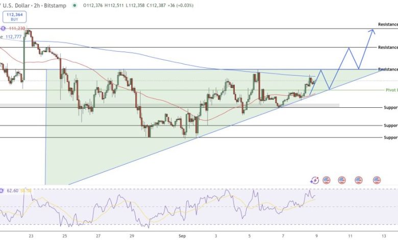 بیتکوین در حال تثبیت در یک مثلث صعودی (Ascending Triangle) است که یک الگوی ادامهدهنده صعودی محسوب میشود. قیمت در ۱۱۲,۳۸۷ دلار قرار دارد و به مقاومت ۱۱۳,۴۰۰ دلاری فشار آورده و از اواخر اوت کفهای بالاتری ساخته است.