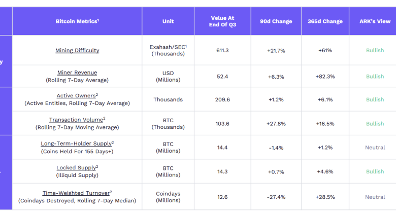 - میزان سختی استخراج (Mining difficulty) در سهماهه سوم ۲۱.۷٪ و در مقایسه با سال گذشته ۶۱٪ افزایش یافت و به ۶۱۱ EH/s رسید که نشاندهنده امنیت بیسابقه شبکه است.