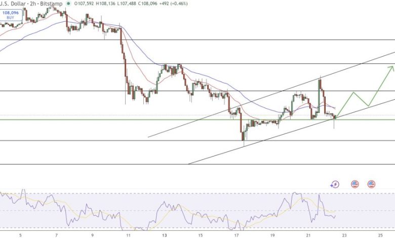 بیتکوین (جفت ارز BTC/USD) پس از یک هفته پرنوسان از فروش و بهبود، در نزدیکی ۱۰۸,۰۰۰ دلار در حال تثبیت است. نمودار ۲ ساعته نشان میدهد BTC درون یک کانال صعودی نگهداری شده که در صورت حفظ حمایت نزدیک ۱۰۷,۴۰۰ دلار، بهبود بالقوه را signal میدهد.